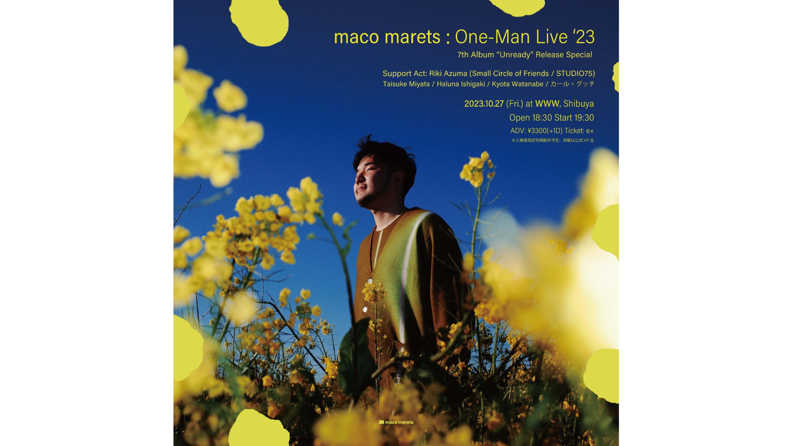 为庆祝专辑发行,他们的第二场单人现场 “maco marets One-Man Live’23 – 第 7 张专辑《Unready》发行特辑-“将于 10 月 27 日(周五)在东京涩谷举行。该活动于 10 月 27 日(星期五)在东京涩谷的 WWW 举办。活动将分为两个部分:以 “Unready “中的歌曲为主题的个人舞台和特别乐队的现场表演,并将在日后公布为所有参加者提供的限量特别优惠。门票目前正在e-plus出售。